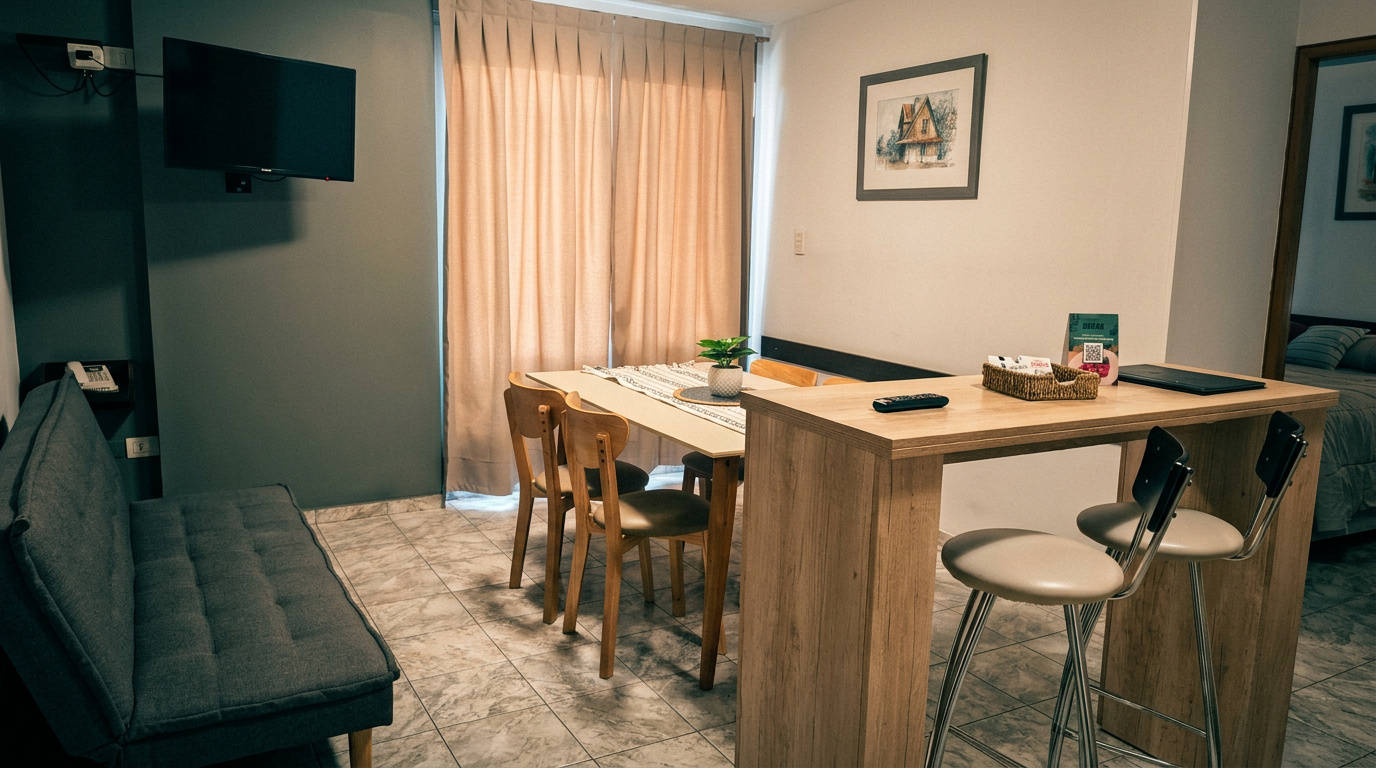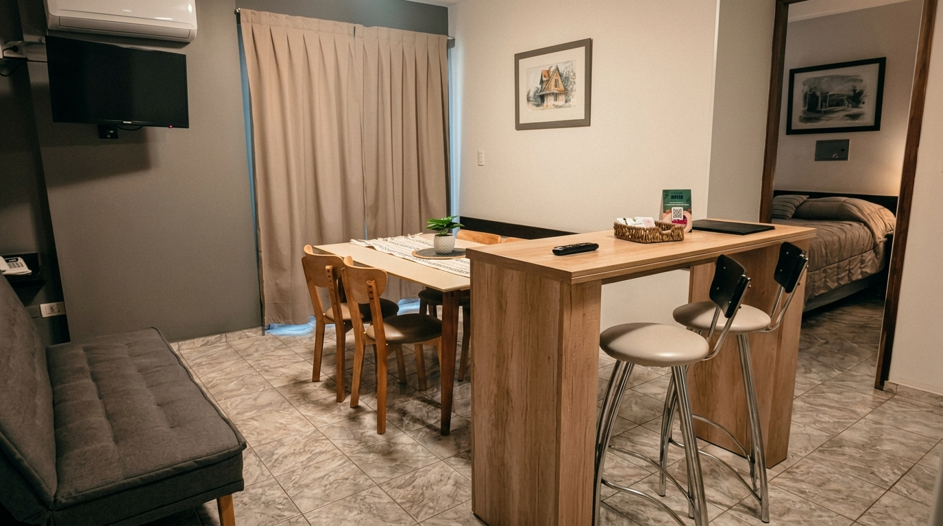 Departamento de dos ambientes, habitación y sala de estar. Puede reservarse como simple, doble o triple.