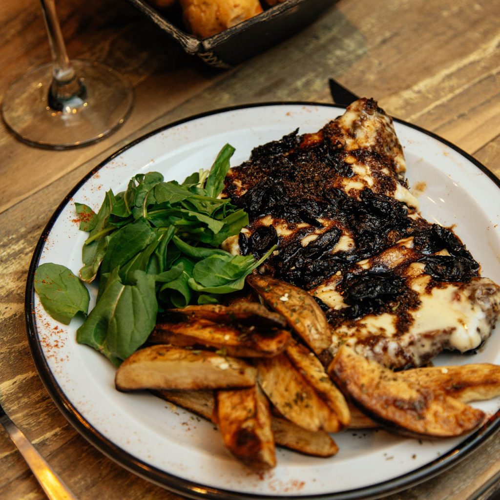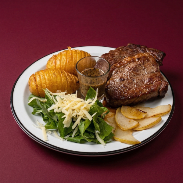 Lomo redondo vacuno, papas rústicas con crema ácida, rúcula y pera asada.