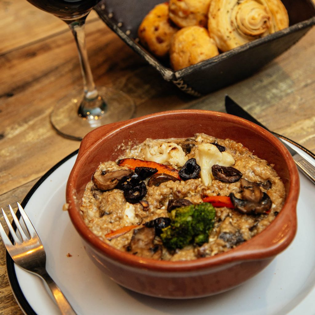 Arroz, verduras de estación, caldo, queso parmesano, champignon, aceitunas negras, huevo, hongos de pino.