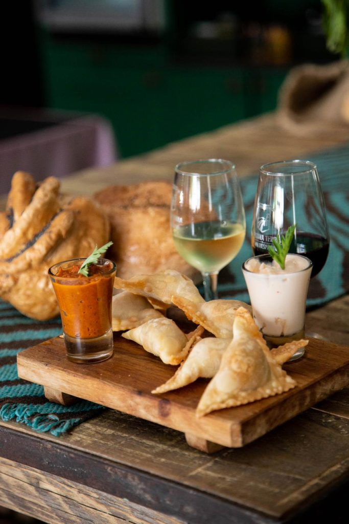 6 Triangulini fritos de bondiola de cerdo, pesto de tomate seco, lactonesa con ajo.