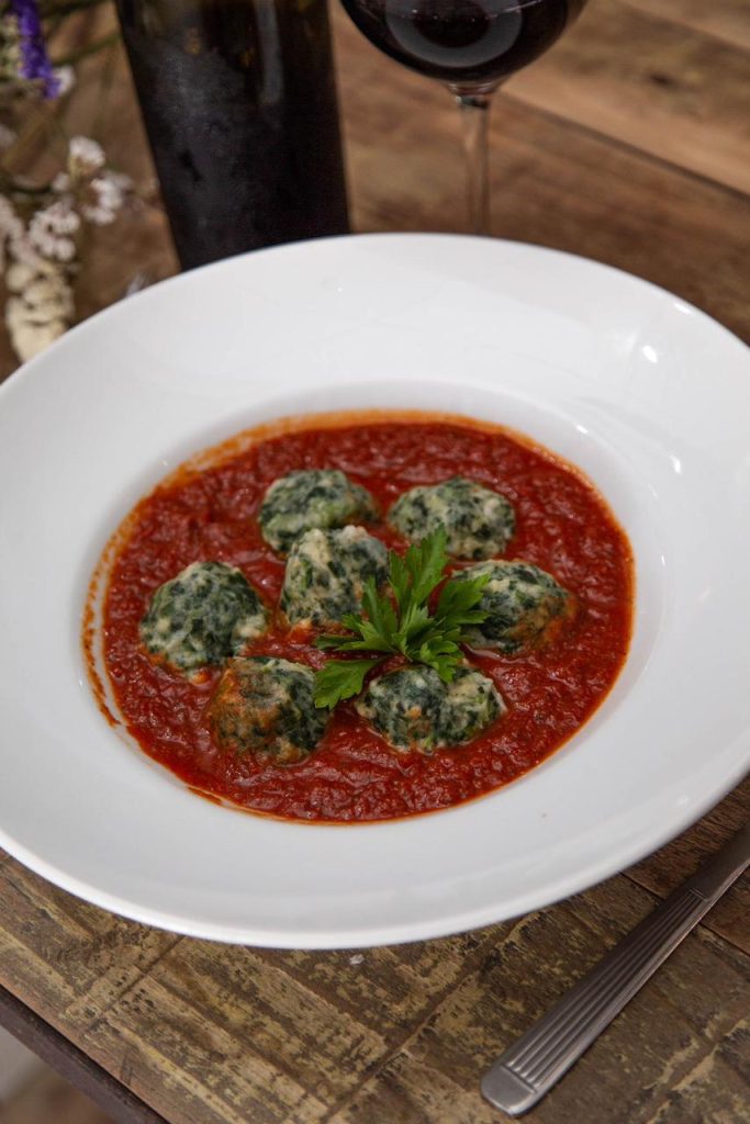 Malfatti de espinaca y parmesano con tuco a base de pollo.