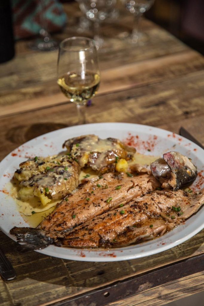 Trucha Arco iris a la manteca y tomillo con crema cítrica y papas rústicas fritas.