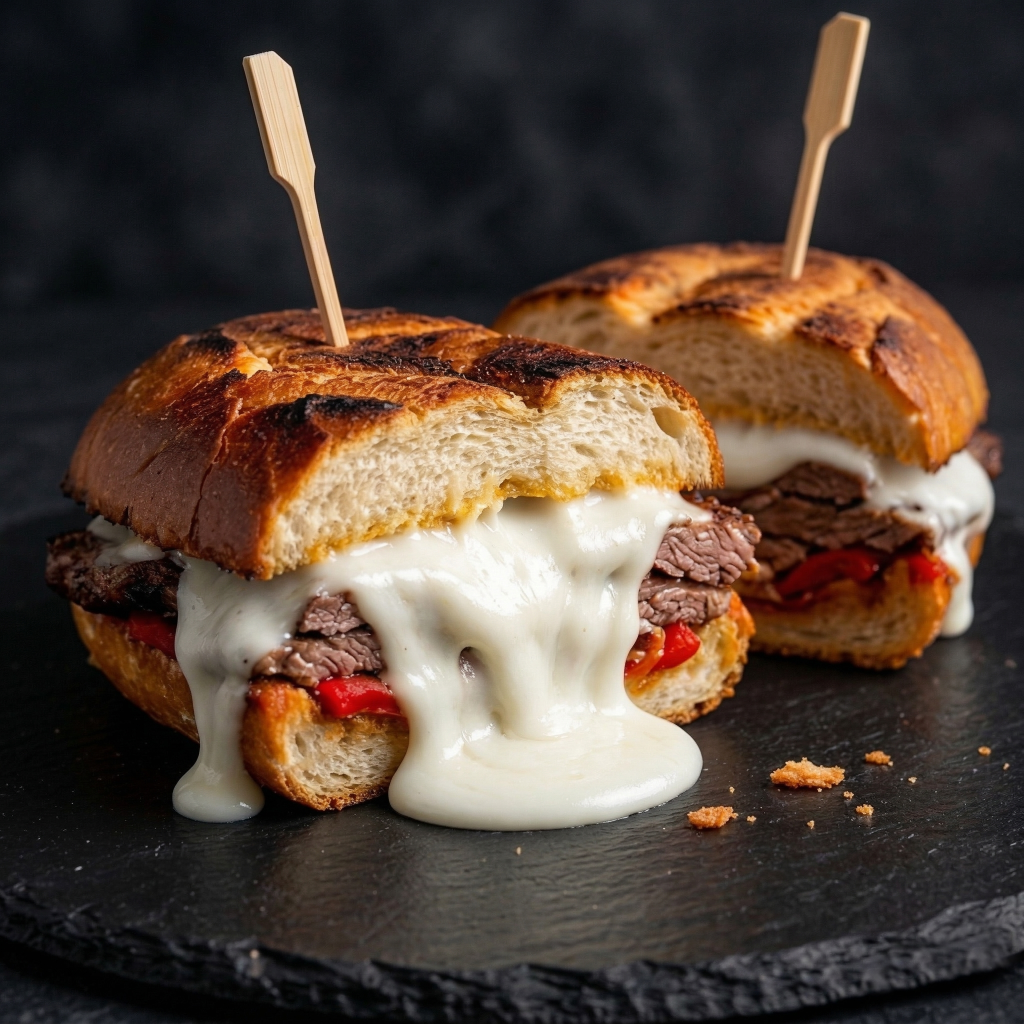 Lomo vacuno, pan tostado, queso cremoso, tomate triturado y mayonesa.